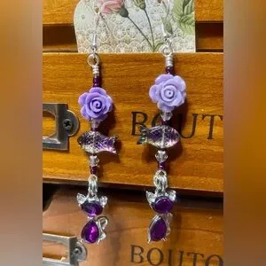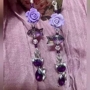 Elegant purple dangle earrings featuring purple and clear gem cats with their favorite fishy treat and a beautiful lavender rose. All accents in silver. Add a touch of whimsy to your day and celebrate your kitty!