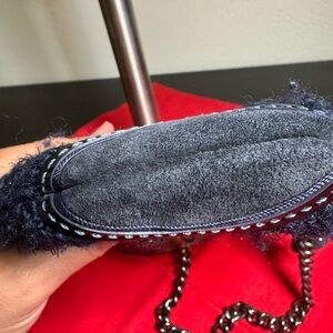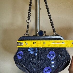 Chic Coach clutch with vibrant blue floral accents. Features a sleek chain strap and signature tag.