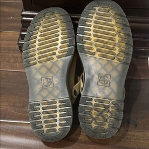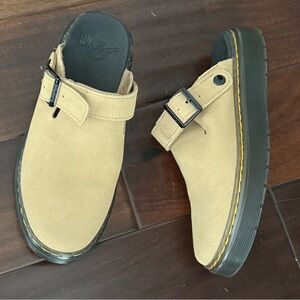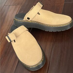 Beige suede slip-on shoes by Dr. Martens. Features a sturdy black sole and adjustable strap.