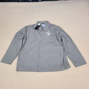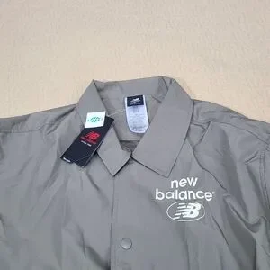 New Balance Essentials Coach windbreaker jacket. Olive Green color way with Tan logo and script on the front. Features full button up front, 2 front pockets and pointy collar. Size XL brand new with tags.
