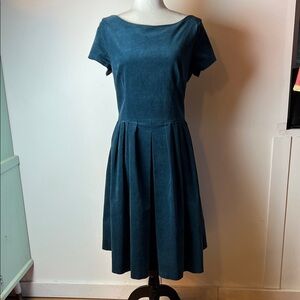 This lovely teal (between blue and green) boatneck dress has back zip and is ideal for special occasions, dates, weddings and swing dancing. Its classic pinup silhouette offers a subdued and vintage inspired look. It is made with textured fabric, soft with a low pile.