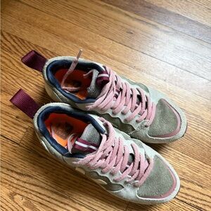 Stylish Veja sneakers with a gray and pink upper. Cream accents add elegance. Perfect for casual wear. Worn twice! Just in between sizes and they didn’t fit!