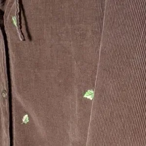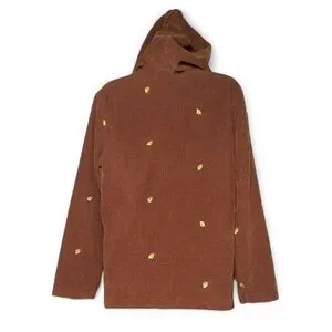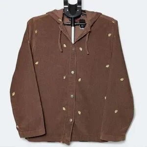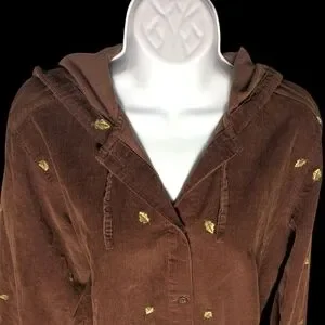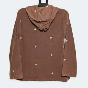 Vintage-inspired 100% cotton corduroy hoodie featuring embroidered golden leaf details throughout. This unique button-up design combines cozy corduroy texture with casual charm — perfect for fall layering or cottagecore streetwear looks.
