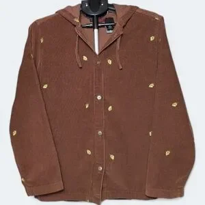 Vintage Corduroy Button Up Hoodie Casablanca Sport Brown 90s Leaf Embroidery