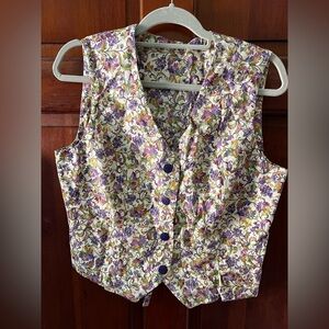 Charming vintage floral vest featuring a vibrant tapestry-style print in purple, yellow, and green on a cream background. Designed with a V-neck, button front closure, and an adjustable back tie for a flattering fit. Perfect for cottagecore, boho, and vintage-inspired outfits, whether layered over a blouse, dress, or tee.