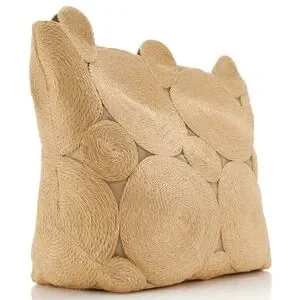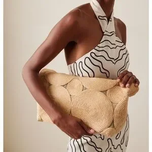 A large fold-over clutch featuring woven straw discs of various sizes overlaid on a soft fabric body.