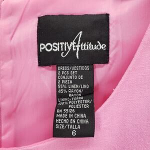 Positive Attitude- Women's Pink Sheath Dress Ruffle Trim Jacket Set Size 6. Linen, rayon fabrics. Lining 100%Polyester. Approx. measurements Dress pit to pit 17 in. Waist 31 in. Dress length 40 in. Jacket pit to pit 18 in. Sleeve length 16 in. Jacket length 19.5 in. Pre-owned in good condition, no holes or stains.