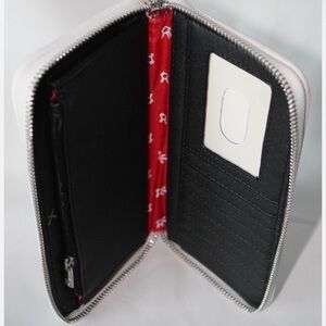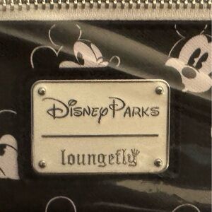 Charming Loungefly wallet featuring Mickey Mouse design. Black and white color scheme. Zipper closure with logo detail.