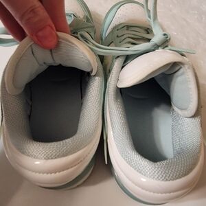 Stylish Nike athletic shoes. Features white and mint colors. Perfect for sports and casual wear.