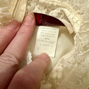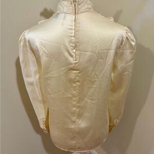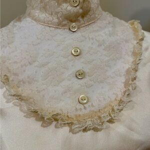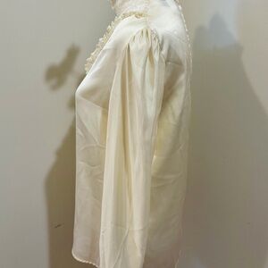 This elegant cream top features delicate lace trim and a classic button-up design. Perfect for adding a touch of sophistication to any outfit. Vintage 80s. Machine wash, tumble dry.