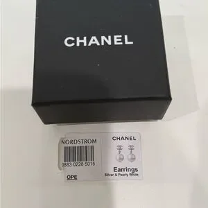 Chic CHANEL earrings with lustrous pearls. Silver accents add elegance. Perfect for any outfit.