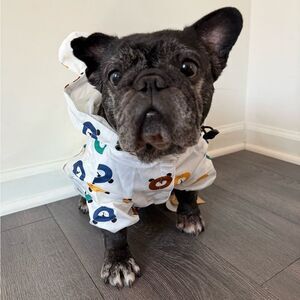 Keep your furry friend dry and stylish with this white dog raincoat featuring a playful bear print. Perfect for rainy days.