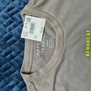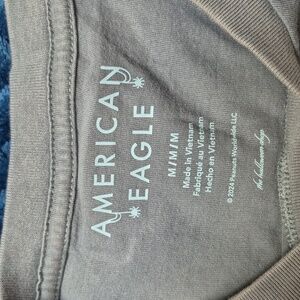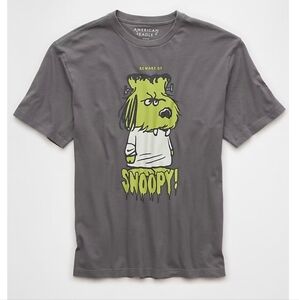 Grey men's graphic t-shirt featuring a monster version of Snoopy with the text 'Beware Of Snoopy!' From American Eagle, this is a size Medium Men's t-shirt. Has that worn in look throughout the body and the neckline. Approx measurements in photos. 100% cotton.