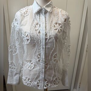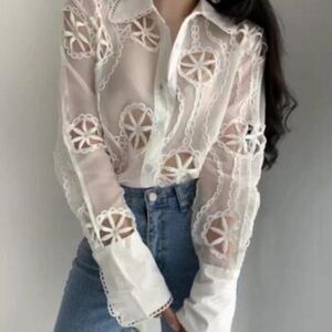 This elegant white lace blouse features intricate cut-out designs, perfect for adding a touch of sophistication to any outfit. Ideal for both casual and formal occasions.