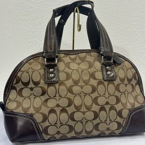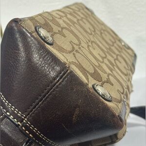 Double top handles are strong and sturdy, satchel has visible scuffing throughout and at bottom corners.