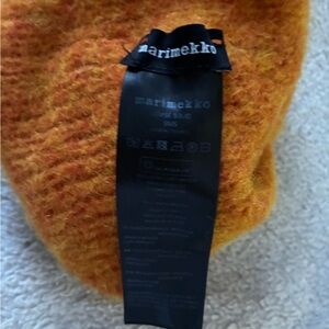 Cozy orange beanie by Marimekko. Features a stylish logo patch. Ideal for chilly days.
