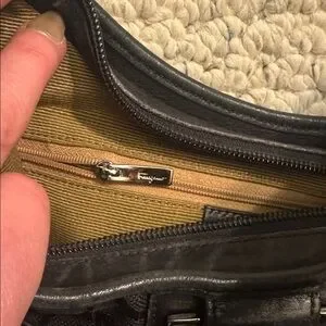 Vintage Salvatore Ferragamo black signature canvas & leather hobo bag with silver hardware. Classic tan interior. Gorgeous bag with lots of life left! Slight wear on corners, all piping intact, strap in good condition. No major flaws but missing part of the main zipper - this does not affect functionality.