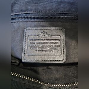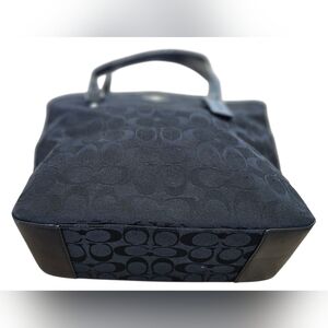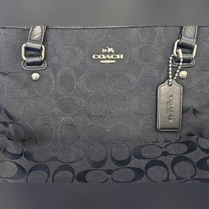 Excellent used condition. Very clean inside and out! Their is a tiny spot on the bottom of the bag, but it can be cleaned. On the bottom of the leather trim, a very small indent and 1 tiny spot. The silver hardware and leather are in amazing condition. Zip top closure, 1 exterior zipper pocket, and original hang tag. The enterior has 1 zip pocket and 2 slip pockets. The signature Coach with horse and carriage Monogram Tote, featuring the iconic 'C' pattern in a sleek black-on-black design. Crafted with leather trim and silver-tone hardware, this tote offers a sophisticated touch to any ensemble. Color may vary due to camera lighting.