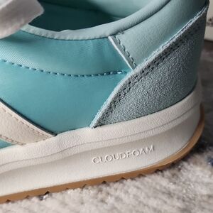 Classic Adidas Cloudfoam sneakers in aqua with white stripes. Features a gum sole for a vintage look. Very small marks on left shoe, see photo. Comes with original box but there is a little damage to the lid, see photo.