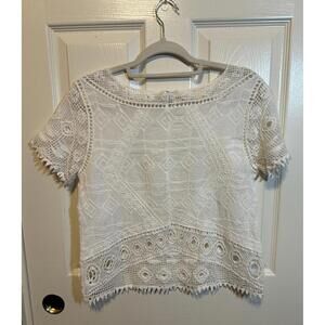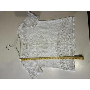 Beautiful Ultra Pink Boho white crochet lace top from Anthropologie featuring intricate patterns and a scalloped hemline. Short sleeves with delicate lace detailing. Perfect for casual or dressy occasions.