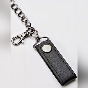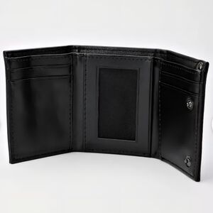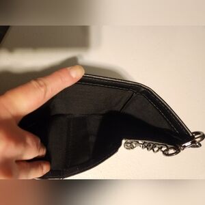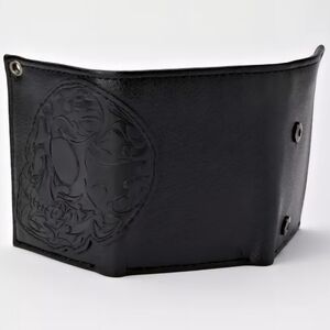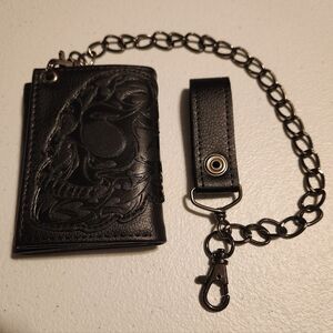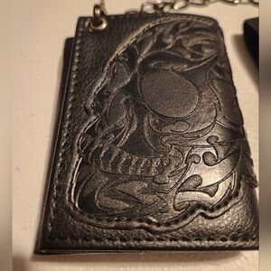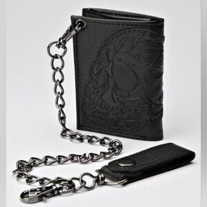 Bold black wallet with embossed skull design. Features a durable chain. Perfect for a daring look.
