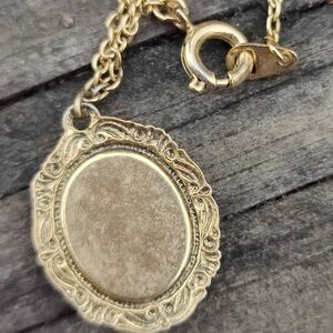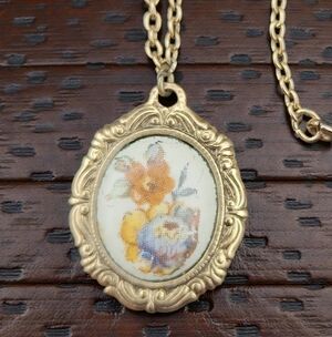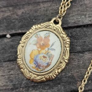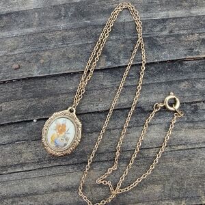 Charming vintage necklace with a gold frame. Features a delicate animal design.