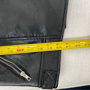 Chic black faux leather jacket with silver accents. Features asymmetrical zipper and stylish lapels. Ideal for a modern, edgy look.
