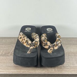 Y2K Yellow Box Leopard Print Platform Flip Flops - Size 7