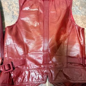 Stylish burgundy leather jacket and vest set. Perfect for a bold look.Coat 11/12 fits like a m/l and vest 9/10 fits like a med