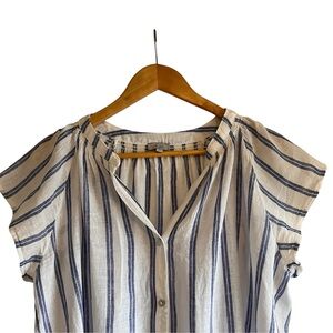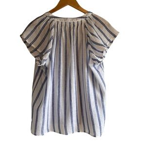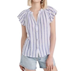 This is a Rails Alena Linen Blouse in Villa Stripe. It’s a button down with a short flutter sleeve. It’s lightweight and blue and white. Note that some of the photos have a bit of a yellow tinge to them but it’s just the lighting. It’s a size medium and in excellent condition.