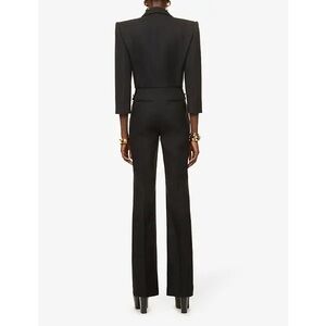 Designed with a structured regular fit, it features commanding padded shoulders, elegant notched lapels, and a flattering bootcut leg that elongates the silhouette. Three-quarter sleeves lend a sophisticated edge, while textured gold-toned buttons provide a striking contrast against the rich woven wool.