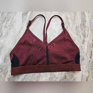 Stay supported in this Nike Dri-Fit sports bra featuring breathable mesh panels and adjustable straps for a customized fit. The rich burgundy color pairs well with any workout look, and the stretchy performance fabric offers comfort during low to medium impact activity. Size Small (S). Good pre-owned condition with no noted flaws.
