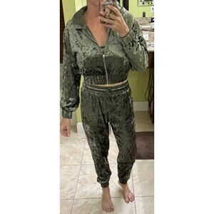 Boutique 3 piece set medium green crushed velour jogger tube top zip jacket $79 retail NWOT 70's y2k trendy Step out in luxurious comfort and style with this absolutely lovely 3-piece crushed velour loungewear set from Boutique!