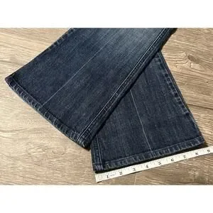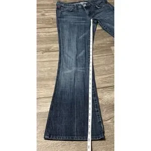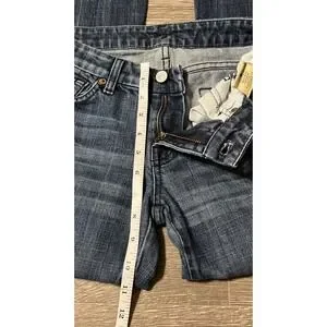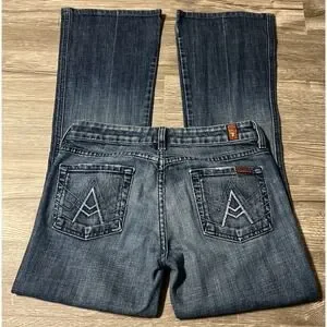 Excellent, pre owned condition women's 7 for all mankind "A" Pocket Boot Cut Jeans. Reputable, popular jeans brand name. A vintage pair, made in the USA. Designed with a cotton stretch blend of materials. Low rise with factory distressing of whiskering and hand sanding. Fitted through hip and thigh with a flare out from knee to hemline with boot opening. Back pockets embroidered with signature "A" design. Logo brand tags on back pocket and waistband. No noticeable flaws or stains. Measurements included to help with sizing.
