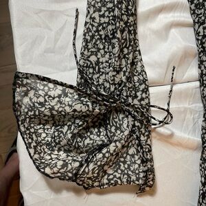 Abercrombie & Fitch black and white floral wrap dress crafted from a lightweight, semi-sheer fabric with a soft, flowy drape. Designed with a flattering V-neckline and wrap-style bodice, it features an adjustable waist tie that defines the silhouette for a comfortable, customized fit. The skirt and wrap edge are finished with delicate ruffle trim, adding movement and feminine detail, while a smooth inner lining provides coverage and comfort. The small-scale floral print gives the dress a classic, versatile look suitable for both casual daytime wear and dressier occasions. T10, B20