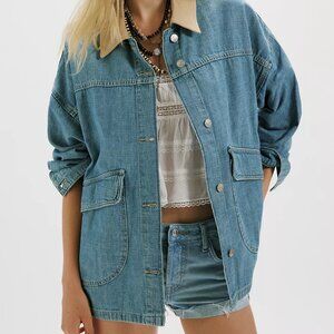 Features: Comfy denim fabrication, contrasting canvas collar, asymmetrical pockets, drop-shoulder sleeve, button-front closure, button-cuffs