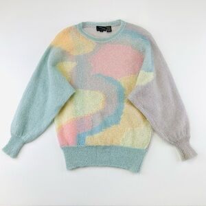 80s Vintage pastel mohair sweater womens Medium round neck abstract