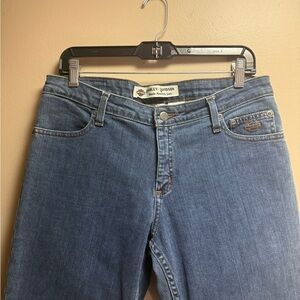Authentic Harley-Davidson Genuine MotorClothes women’s stretch rider jeans in excellent condition. Made in Mexico from premium stretch denim, these jeans feature Harley-Davidson branded hardware, embroidered logo detail, and classic rider fit construction.