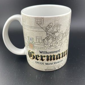 Rare Disney Epcot Germany Pavilion "Willkommen!" Mickey and Minnie Mouse Mug.