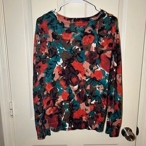 Beautiful Talbots floral cardigan in a rich fall color palette of teal, rust, brown, and soft pink. Features a flattering scoop neckline with full button front closure and long sleeves.
