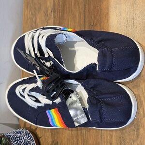 Stylish and comfortable, these Torrid wide width sneakers feature a vibrant rainbow stripe on a navy canvas. Perfect for everyday adventures.