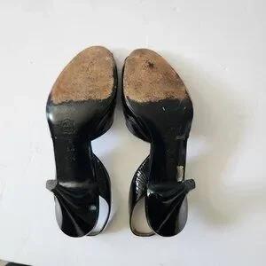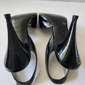 Iconic Thierry Mugler vintage 1980s black patent leather slingback heels. These sculptural peep-toe pumps offer a high-glamour, Old Hollywood bombshell aesthetic—think Marilyn Monroe meets 80s Runway.