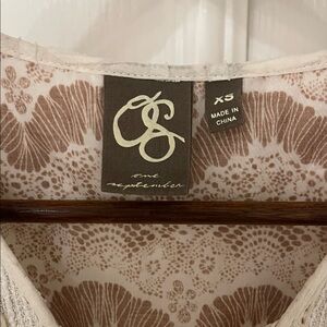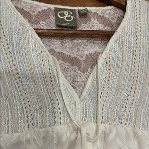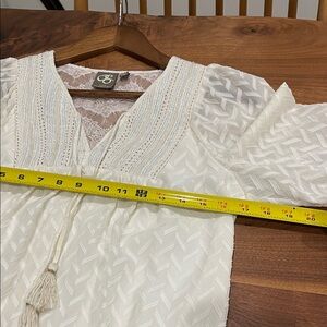 Chic cream blouse with sheer lace accents. Features a stylish tassel tie. Perfect for versatile wear.