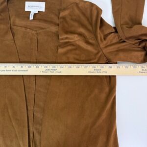 BCBGeneration open front cardigan jacket crafted from a soft faux suede material in a rich cognac brown.
