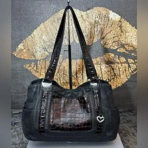 Brighton Black Pebbled Leather and Brown Croc-Embossed Accented Hobo Shoulder Bag