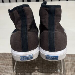 Adidas Matchcourt High RX skate shoes. Men's size 13 in excellent condition. Two-tone style with black suede at the front of shoes and dark brown canvas in the back. Classic Adidas three stripes and midsoles in white. Gum rubber soles are very grippy for your board! Ideal for casual wear on your skateboard or stepping in style down the street. The thin, flexible vulcanized sole delivers responsive board feel and grip. Please see photos for full details and comment with any questions. Thanks for looking and please tell your friends. All love, love all!