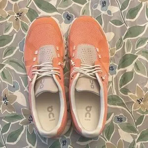 Step up your game with these stylish women's athletic shoes in peach and white. Perfect for any workout, these shoes offer comfort and support. Size 8 W woman’s