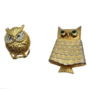 Bundle of two brooches - One Stunning Vintage Estate Signed Avon Makeup Owl Compact Brooch. Gold tone worn off along edges *see photos*. One unsigned gold tone owl brooch with rhinestones. Mid century, art deco, estate sale costume jewelry bundle