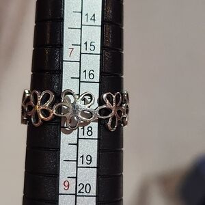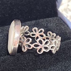 Beautiful and elegant piece of fine jewelry. Made with natural mother of pearl as the main stone set in silver. Shank of the ring designed as a row of daisies - fine craftsmanship.