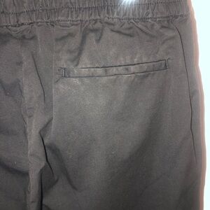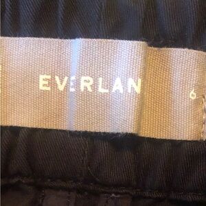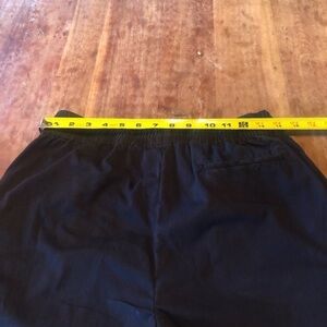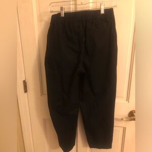 Preowned, no visible flaws. The design is a high waist pull on cotton pant. The design is called The Easy Pant. It runs a little oversized because it is designed to be loose fitting. The fabric content is 98% Cotton, and 2% Elastane. The color is a dark black. The size is a sz 6. These pants are so easy to wear. They look great with a blazer or a jean jacket. You will look so put together and be very comfortable. Thanks for stopping by!